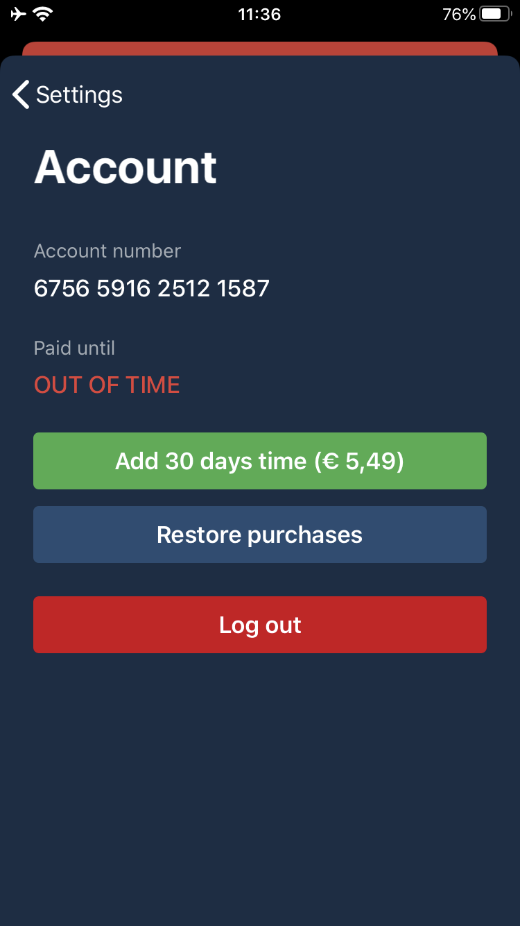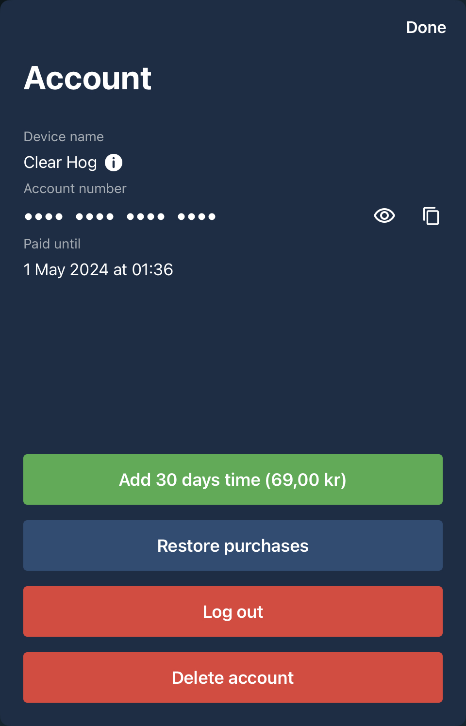 Here you can view your account number, the device name and when your paid time runs out. Tap the account number to copy it to your device’s clipboard.