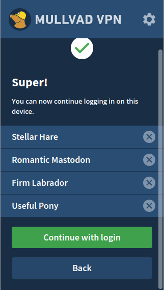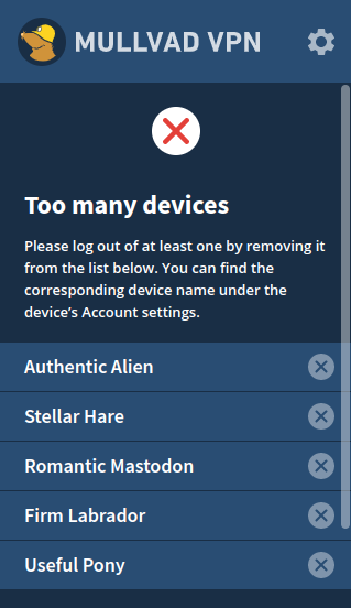 - To be able to log in you will need to remove at least one of the devices, by tapping the X to the right of the device name. To make sure you don't delete a device that you are using, open the Account settings in the Mullvad app on each device to see its device name (if you do not see it then make sure you have updated the app). If you are using WireGuard outside of the Mullvad app then see instructions below.