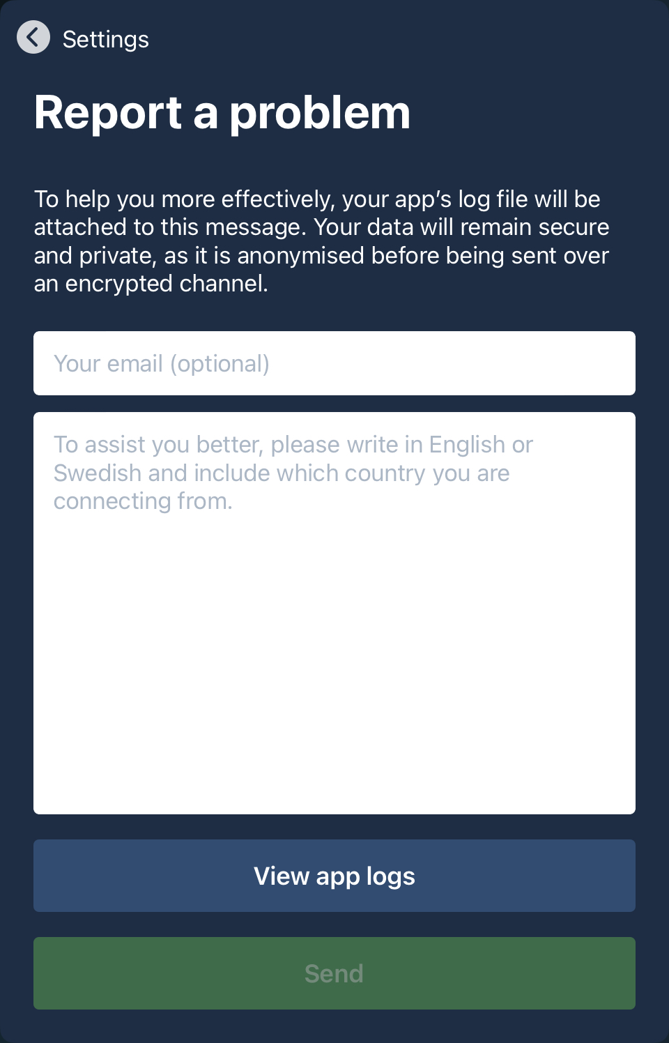 If you are having any issues you can let us know by sending a problem report with the app's anonymized log. Enter your email address if you want a reply. Describe your problem in English or Swedish. You can also tap on View app logs to see the log yourself.